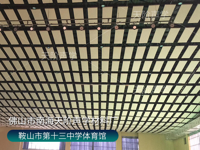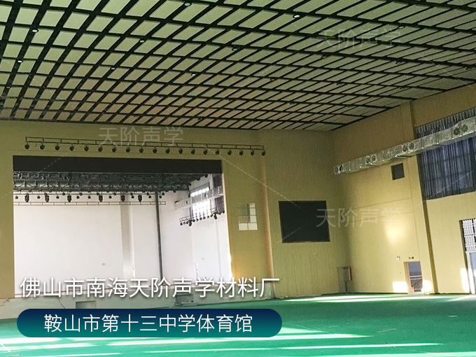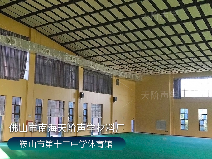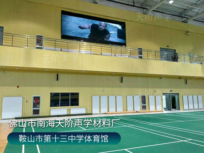 鞍山市第十三中學體育館,墻面使用槽木吸音板,基材選用不燃堅硬的玻鎂基材,飾面選用活力青春的色調。條形開槽吸音板,吸音效果顯著,能吸收活動期間的噪音,回聲。