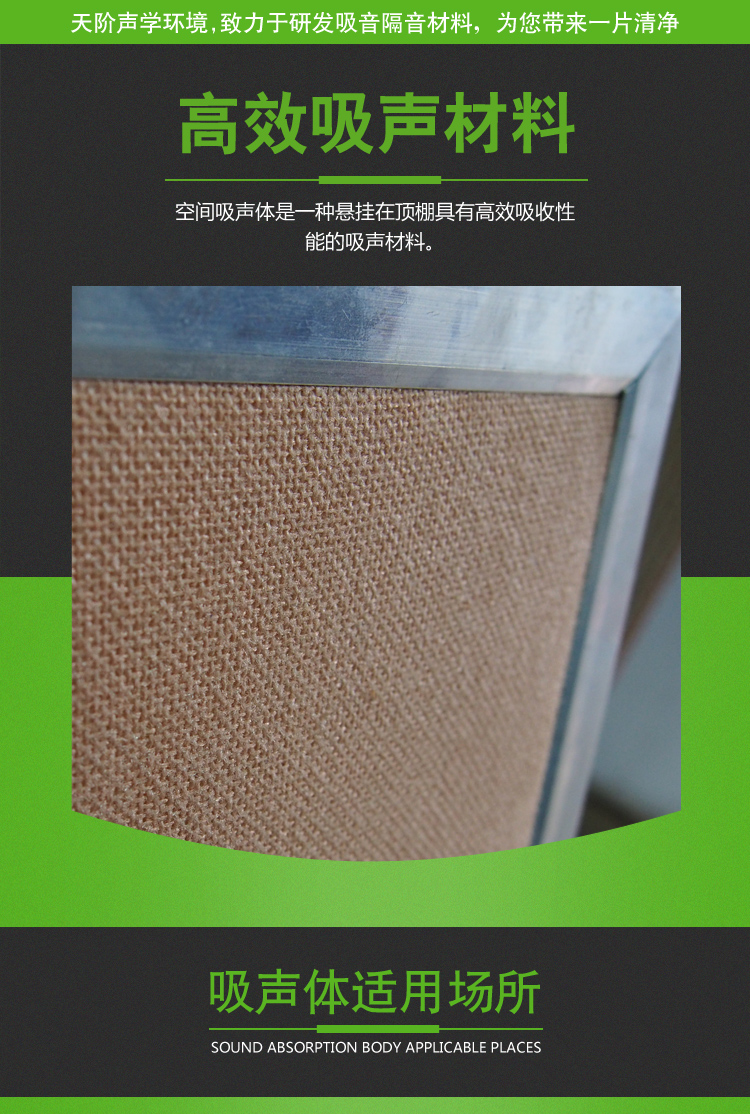 空間吸聲體的吸聲性能常用不同頻率的單個吸聲體的有效吸聲量來表示。空間吸聲體吸聲降噪(或降低混響時間)的效果主要取決于空間吸聲體的數量、懸掛間距以及材料和結構