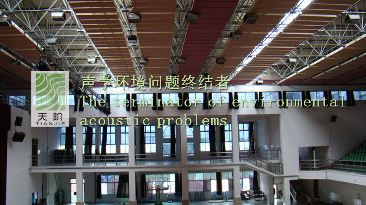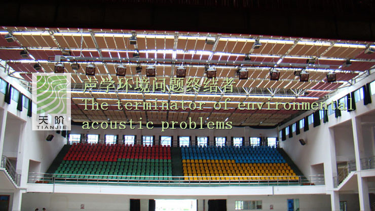 東莞中學(xué)體育館采用的是空間吸聲體。空間吸聲體是一種懸掛在頂棚具有高效吸收性能的吸聲材料。空間吸聲體一般水平或者垂直吊掛。空間吸聲體面積占頂棚面積30%-40%時其材料的吸聲性能是其他聲學(xué)材料吸聲性能的2倍。