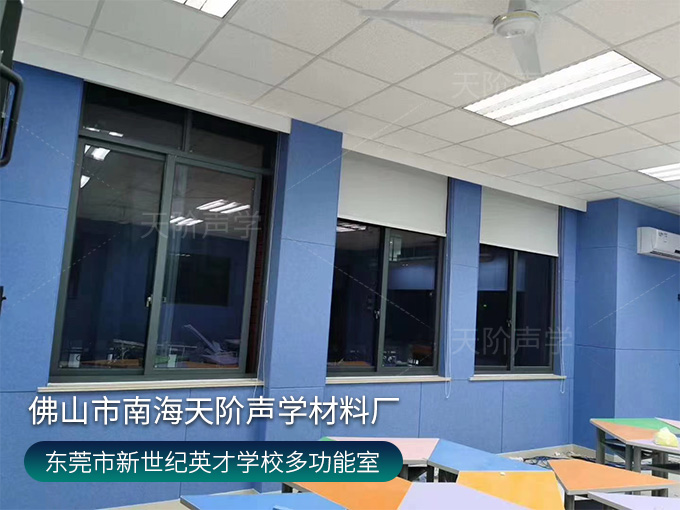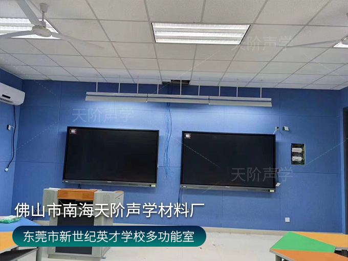 東莞市鳳崗鎮鳳崗新世紀英才學校錄播室項目,選用活力的藍色聚酯纖維吸音板,減少錄入回聲、雜音。