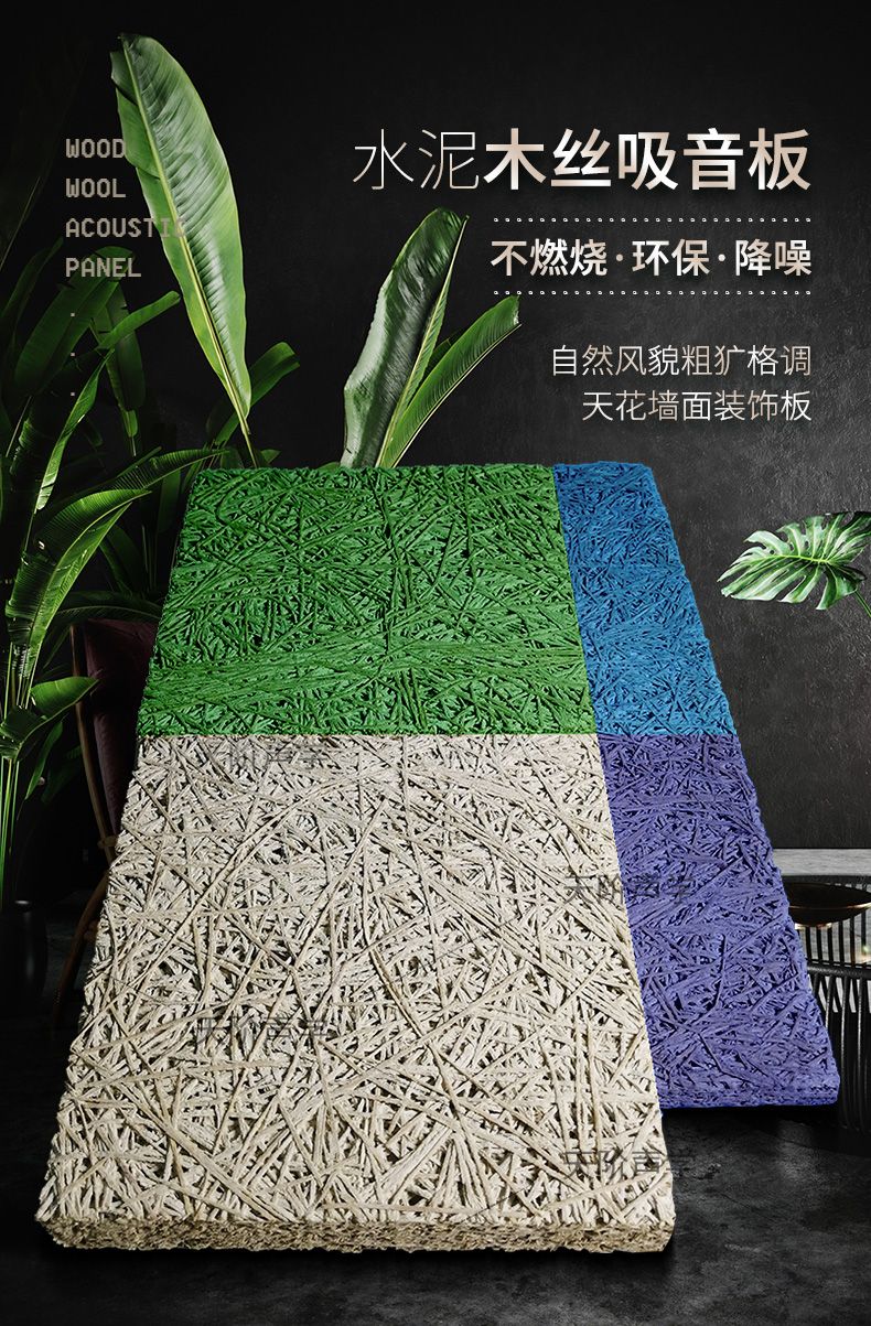 木絲吸音板以白楊木纖維為原料,結合獨特的無機硬水泥粘合劑,采用連續操作工藝,在高溫、高壓條件下制成。該產品擁有只有通過合成若干不同的建筑材料才能獲得的物理特性。外觀獨特、吸音良好--獨有的表面絲狀紋理,給人一種原始粗獷的感覺,滿足了現代人回歸自然的理念。表面可做飾面噴色和噴繪處理.