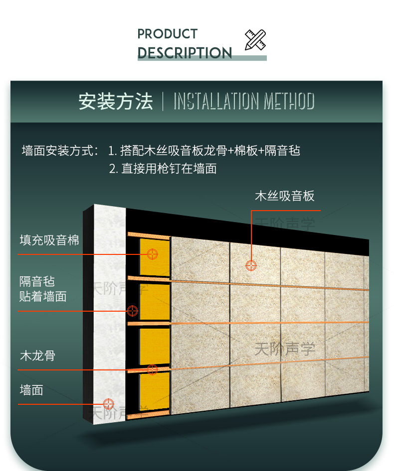 c.輕鋼龍骨,在高層較高或防火要求等級較高的時候,可能不允許施工木龍骨的情況下,一般采用爆炸螺絲吧小段的木墊片固定在輕鋼龍骨上,然后將木絲吸音板固定在木皮上即可。