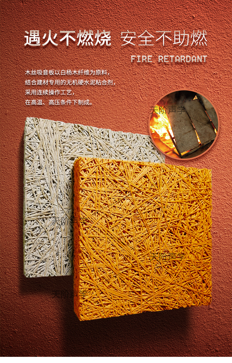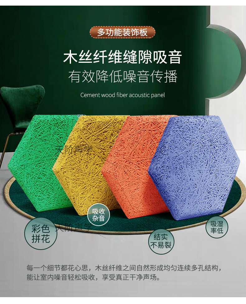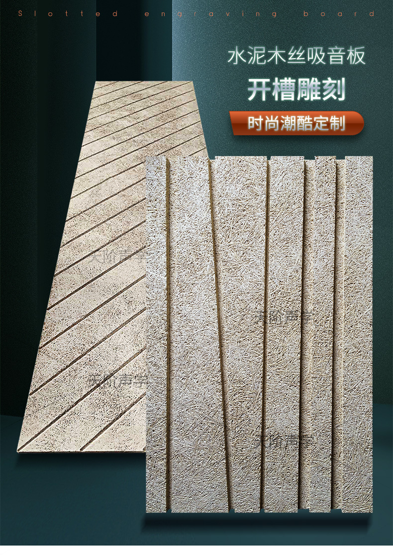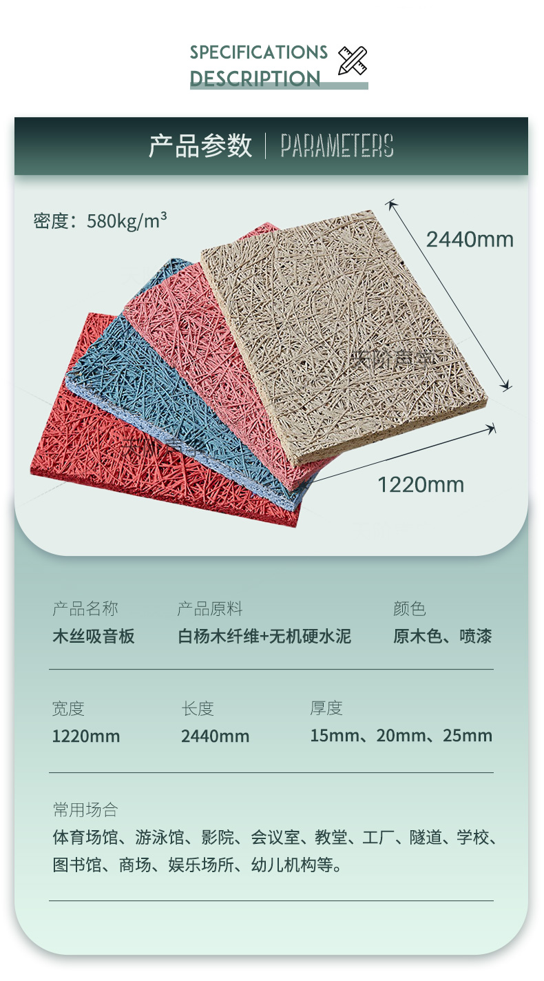 木絲吸音板的表面紋理表現出高雅質感與獨特品味,可充分演繹設計師的創意和理念。該產品結合了木材與水泥的優點:如木材般質輕,如水泥般堅固,具有吸音、抗沖擊等多種功能,可廣泛應用于體育場館、劇場、影院、會議室、教堂、工廠、學校、圖書館、游泳館等處。